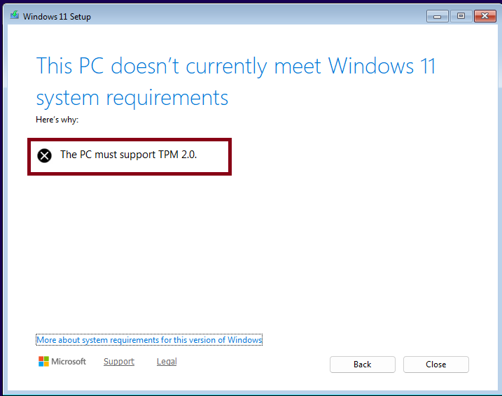 When you create a Virtual Machine without enabling virtual TPM or when you use Generation 1 instead of Generation 2, the Windows installer shows errors like: